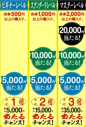 期間中に2,000円以上の舟券を購入すればmasterレベルとなり、最大35,000円が当たるチャンス!
