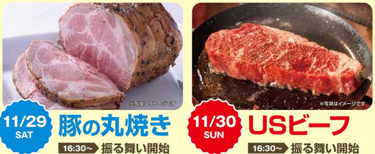 日替わりで両日先着100名様にお肉の振る舞いを行います。