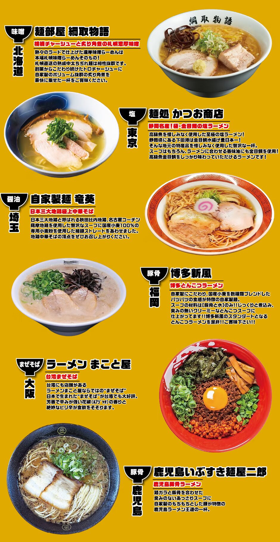 6県が集まるラーメンが集まり、あなたの好みのラーメンを見つけよう。
