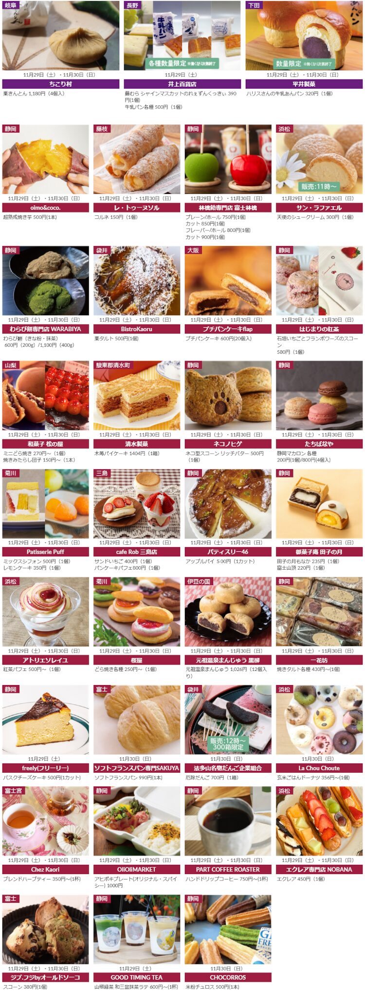 静岡県内から多くのお菓子屋さんが日替わりで登場し、季節のフルーツ、ケーキ、タルト、プリンなど美味しそうなお菓子が会場いっぱいに揃います。