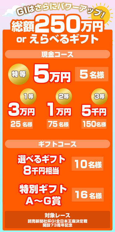 芦屋サンライズメンバーズ モーニングレース誕生15周年記念 特別電話投票キャンペーン! 現金 or 選べるギフトが当たる!